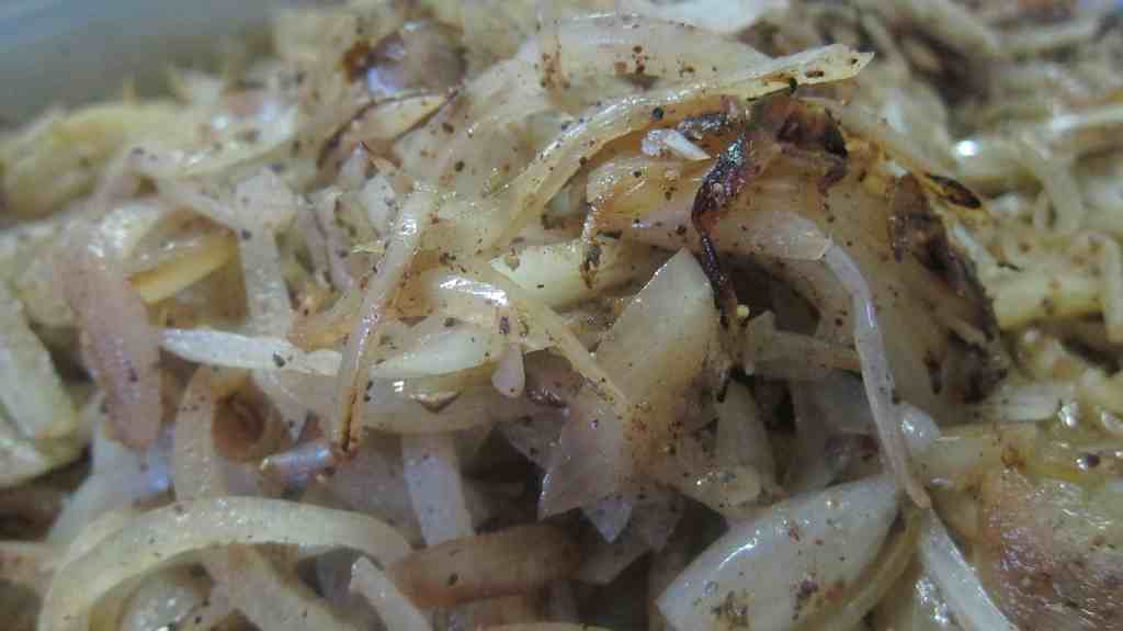 מטגנים בצל פרוס לאורך בלי שמן ועם הרבה בהרט – מוסיפים מעט שמן זית רק בסוף
